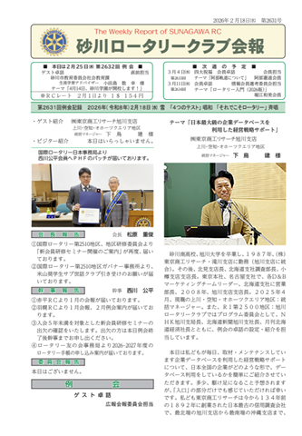 会報第2631号(2026/02/18) 会報 2026.02.24 会報第2631号(2026/02/18) ゲスト卓話 「日本最大級のデータベースを利用した経営戦力サポート」 (株)東京商工リサーチ旭川支店 上川・空知・オホーツクエリア地区 統括マネージャー 下鳥 建様 クリックすると表示されます。↓ 2631.pdf