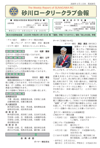 会報第2636号(2026/04/01) 会報 2026.04.07 会報第2636号(2026/04/01) 会員卓話「IMについて」 沢田広志ガバナー補佐・堀江和美実行委員長 クリックすると表示されます。↓ 2636.pdf